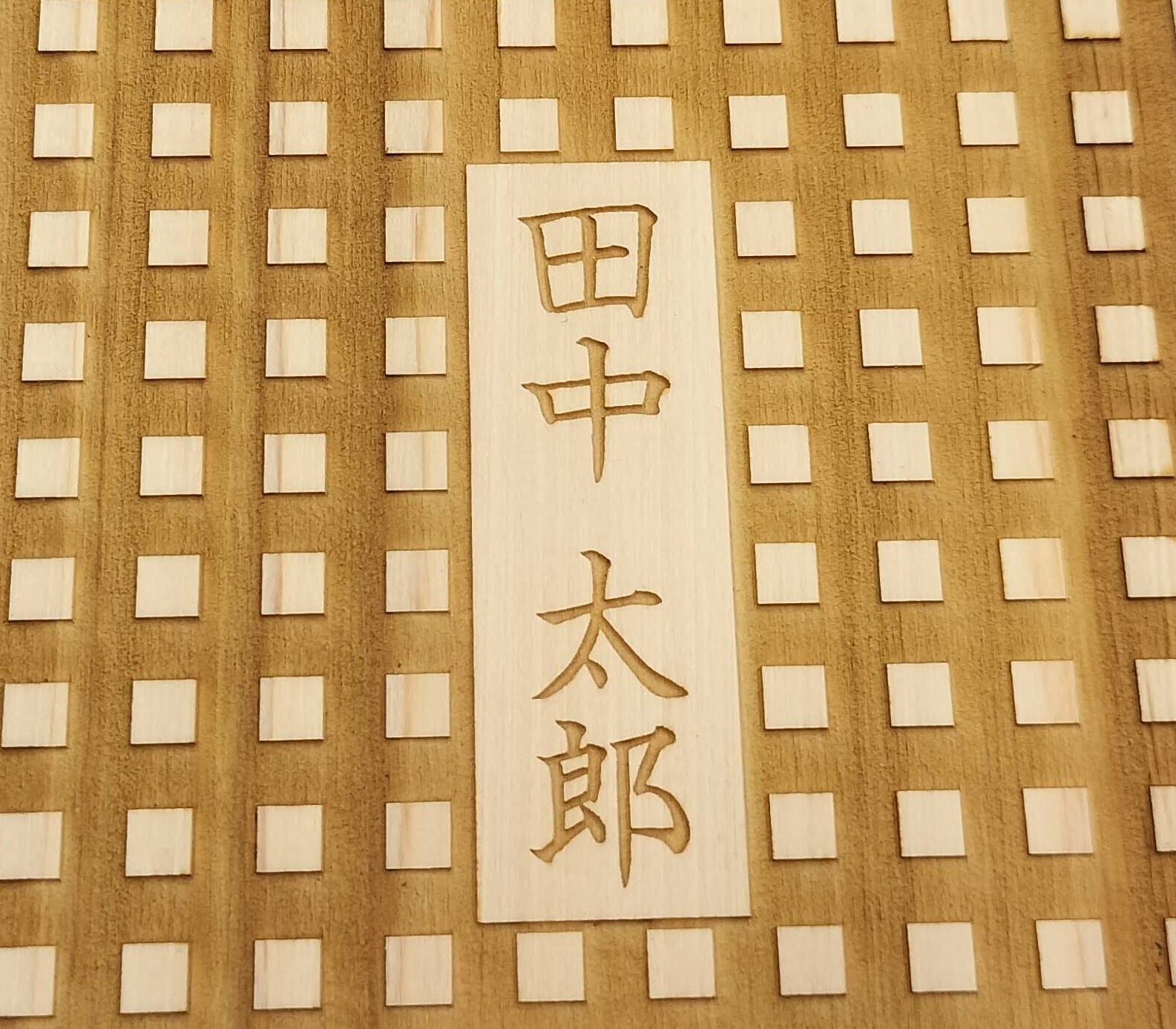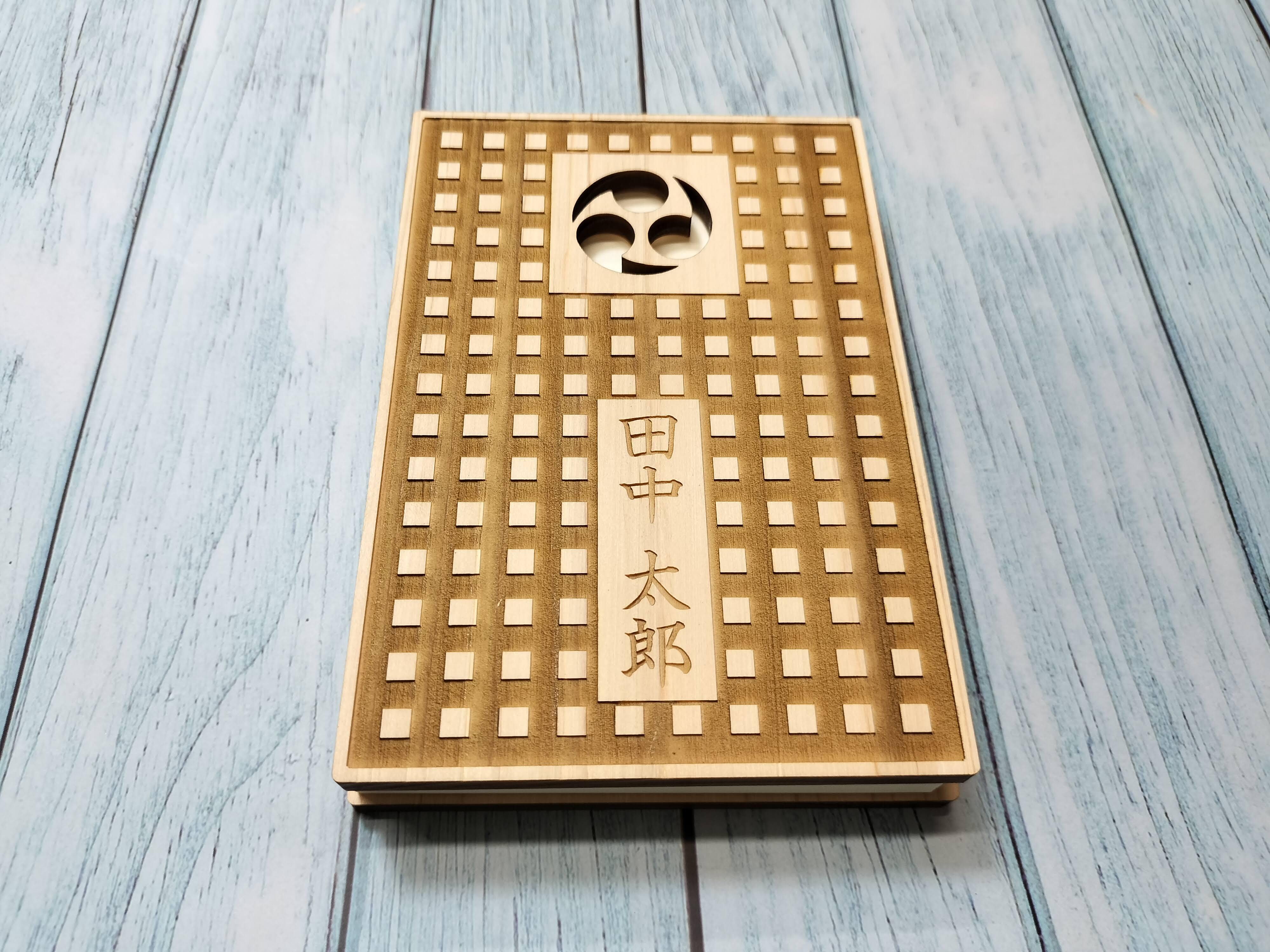 表表紙と裏表紙、家紋、名入れを選べます。 ※基本的には表表紙・裏表紙とも同じ柄となります。違う柄をご希望の場合はその旨チャットでお知らせ願います。 ※2.名入れの文字フォント変更、名前の一部を丸や花の形状で囲ったオーダーメイドロゴ作成も対応可能です。(写真をご参考ください) お選びいただいた内容に基づき、チャット上でイメージデータを送付します。(最大3回) ※3.ヒノキの特質上、反る可能性がありますこと御理解願います。(機能上は問題ございません) また、重しを乗せることで反りを抑えられます。